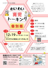 わいわい育児トーキング(個別版) 【テーマ】それぞれの実家とのつきあい方 【申込み】12月6日(土)〜 予約フォーム より |