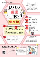 わいわい育児トーキング(個別版) 【テーマ】子どもが集団生活に入る前に 【申込み】1月6日(火)〜 予約フォーム より |